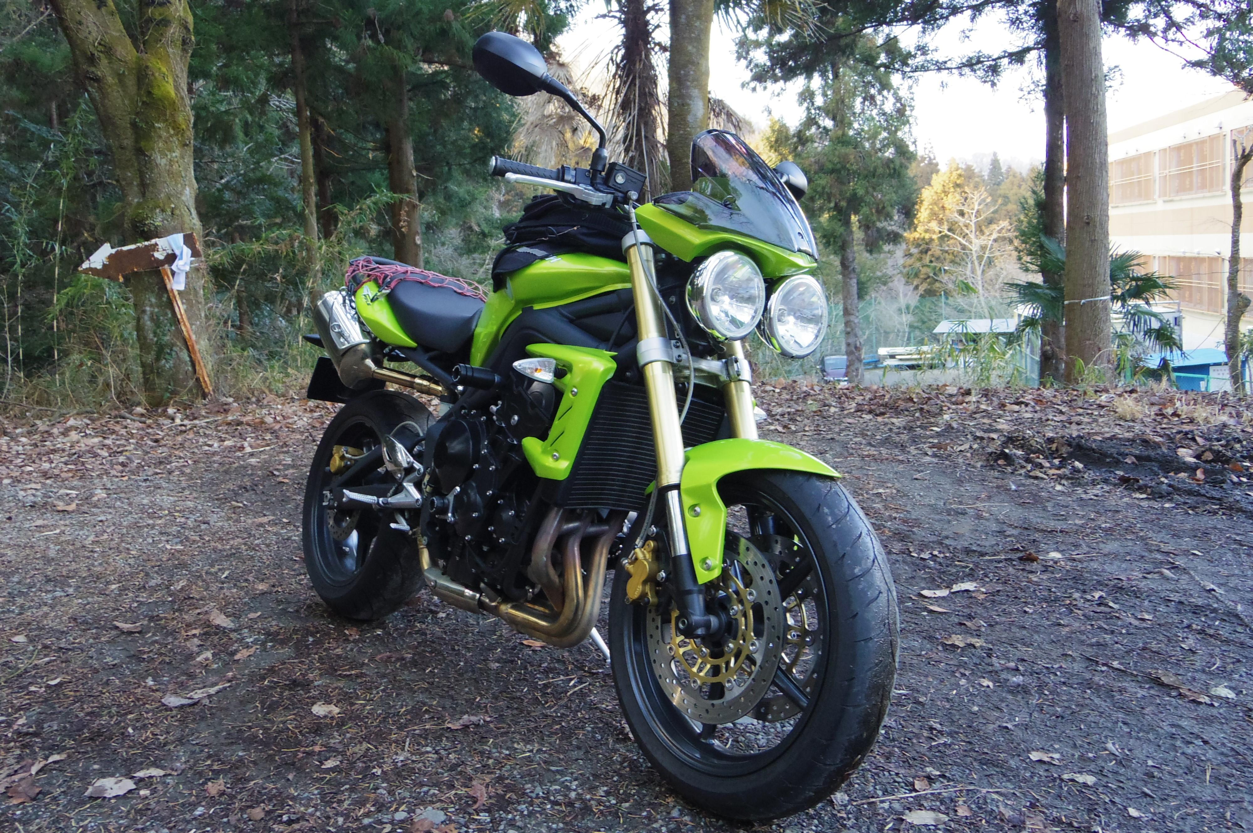 トライアンフのお家芸3気筒675CC通称ストトリ、愛嬌のあるトンボのような丸形2灯ヘッドライトと裏腹に、3気筒特有のトルクフルで108馬力のエンジンと167Kgの軽量な車重の為かなりじゃじゃ馬なバイク。ただし車並みに燃費が悪く大体リッターあたり15km程度になるため財布に厳しいのが難点