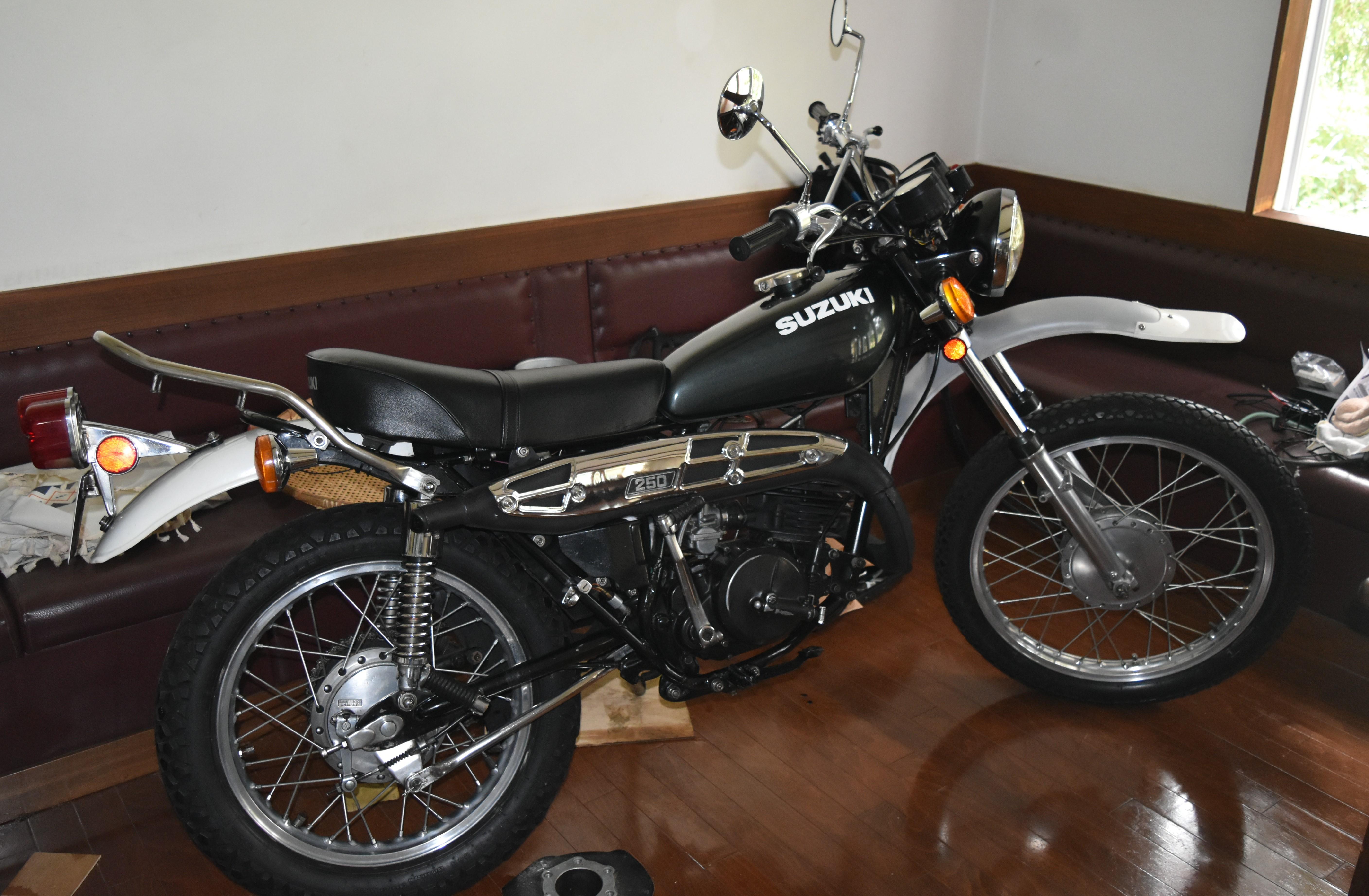 1976年製スズキハスラー、昭和の仮面ライダーのライダーマシンとして有名なトレールバイク、このバイクは8型で1~8型で最もスリムで洗練されたスタイルを持ち人気が高い。もはや2サイクル車は絶滅危惧種で購入するにも手が出せないほど高価になってしまった。スズキの2サイクルバイクはTS とGTシリーズがリンクしておりTS250ピストン3個でGT750、TS125のピストン3個でGT380となる