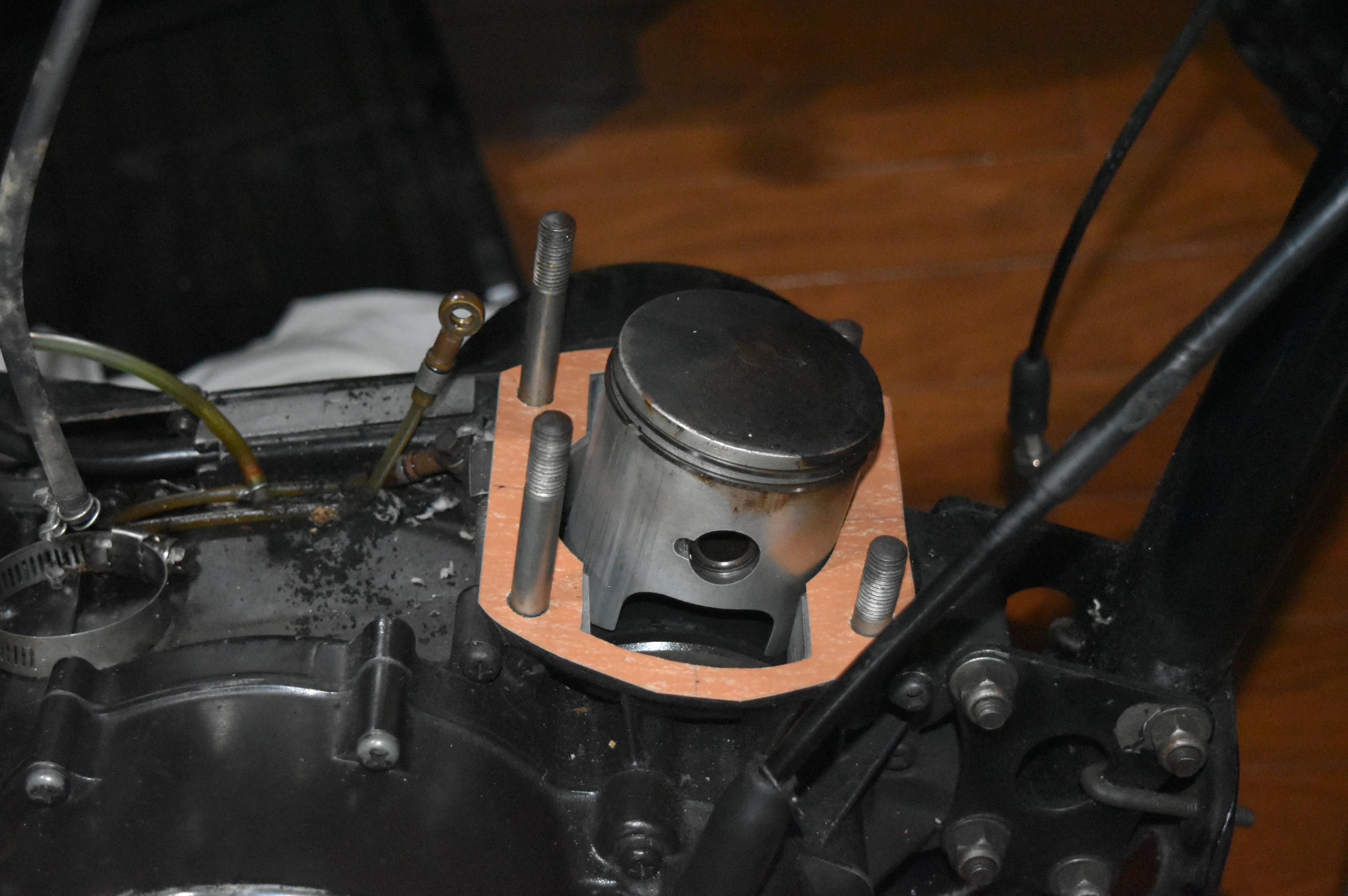 続いてシリンダーを取り外せば、ピストンが見えてきます。ピストンも変えたいところですが、今回はリングだけ交換します。8型だけはメッキシリンダーとなっていますので、他の型式のピストンリングは使えません。ヤフオク等で入手する場合は注意が必要です。ちなみにに部品番号は12140-30600です。